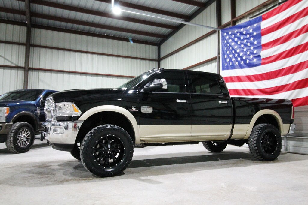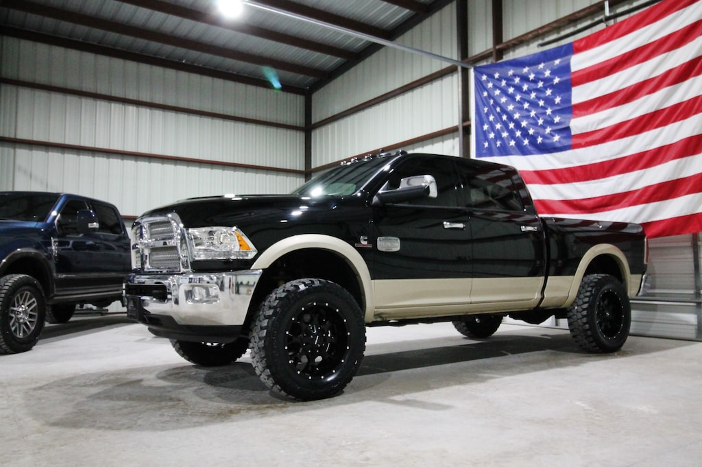 This 2013 RAM 2500 Laramie Longhorn 4x4 is a one-owner truck with only 153K miles and 25 detailed services reported to Carfax, powered by the legendary 6.7L Cummins Turbo Diesel paired with an automatic transmission and electronic four-wheel drive. It’s leveled and sits on brand new 20” Mayhem wheels wrapped in brand new 35” mud-terrain tires, and features factory projector headlights, factory LED tail lights, a B&W gooseneck hitch, and factory RamBoxes for added utility. This truck is very clean and well kept inside and out and features the hard-to-find black and Cattle Tan Longhorn interior with premium saddle leather, dual power seats, fixed center console, sunroof, dual climate control, passive keyless entry with push-button start, power adjustable pedals, factory touchscreen radio with backup camera, built-in trailer brake, and full power options including windows and locks. A sharp, well-maintained Longhorn that combines luxury, capability, and classic Cummins performance.