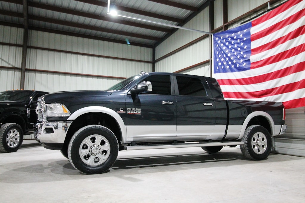 This 2016 RAM 2500 Laramie Mega Cab 4x4 is a one-owner, clean Carfax Texas truck that has been locally owned and meticulously maintained since new, powered by the 6.7L Cummins Turbo Diesel paired with an automatic transmission and electronic four-wheel drive, showing only 149k miles with 39 detailed service records reported to Carfax. It is leveled and sits on brand-new 35” all-terrain tires with Fox shocks, factory projector headlights, factory LED tail lights, Morimoto projector fog lights, a factory gooseneck hitch, and factory wheel-to-wheel running boards, all finished in beautiful Maximum Steel Metallic paint. This truck is extremely clean and straight inside and out, featuring a black leather interior with no foul odors or smoke smells, dual power heated and cooled seats, a heated steering wheel, fixed center console, factory touchscreen radio, sunroof, dual climate control, passive keyless entry with push-button start, factory auxiliary switches, built-in trailer brake, power windows, and power locks, making it a sharp, well-optioned Mega Cab that is equally ready for work or daily driving.