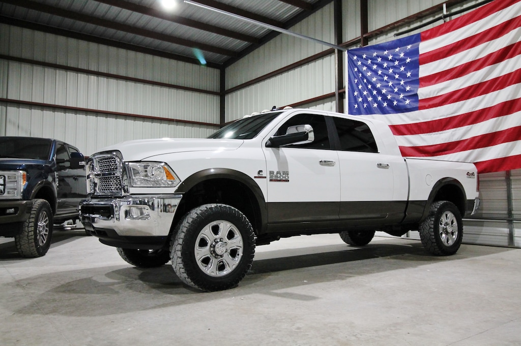 This 2018 RAM 2500 Laramie Mega Cab 4x4 is a two-owner Texas truck with 193K miles and an impressive 50 detailed service records reported to Carfax, powered by the legendary 6.7L Cummins Turbo Diesel paired with an automatic transmission and electronic four-wheel drive. It’s leveled and sits on nearly new Goodyear all-terrain tires, featuring factory projector headlights, factory LED tail lights, beautiful factory two-tone paint, a B&W gooseneck hitch, and AMP power running boards. The truck is very clean and straight inside and out and comes equipped with a leather-loaded Laramie interior including Katskin leather seats, dual power heated and cooled seats, heated steering wheel, fixed center console, factory touchscreen radio, backup camera, dual climate control, passive keyless entry with push-button start, built-in trailer brake, and full power options including windows, locks, and mirrors. This Mega Cab offers a great combination of comfort, capability, and strong service history, making it a well-maintained and ready-to-go Cummins truck.
